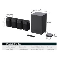 Main Unit : 118 mm X 27 mm X 118 mm Surround : 240 mm X 390 mm X 240 mm Subwoofer : 122 mm X197 mm X 122 mm Package : 540 mm X 375 mm X 495 mm |